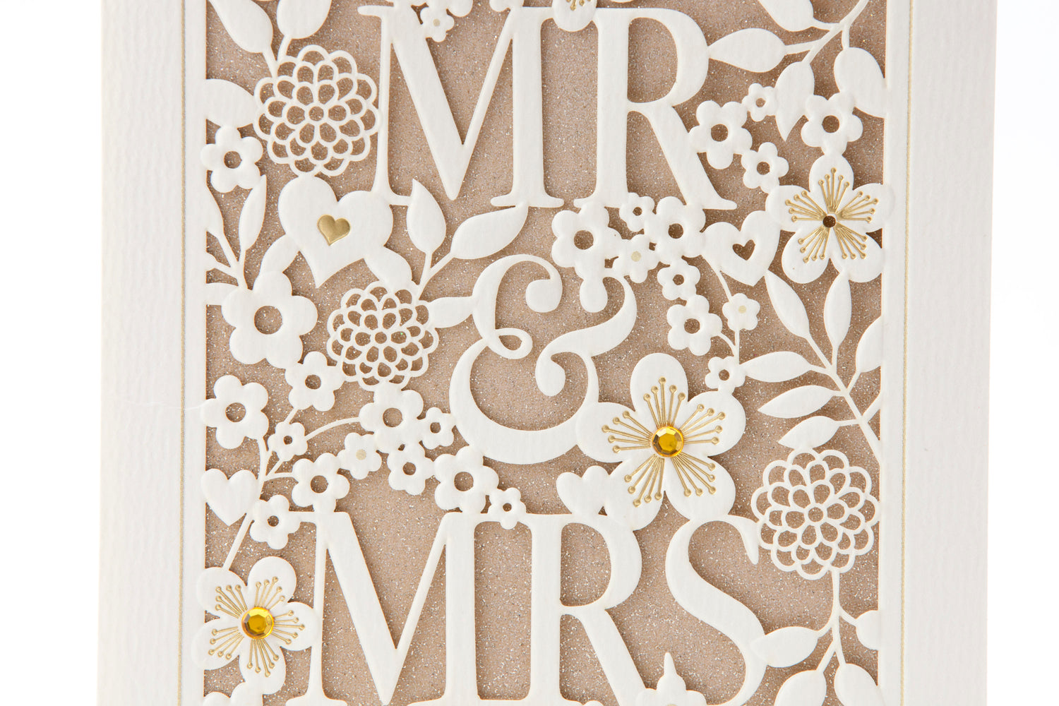 Commemorate your family and friend's big day with this wedding card featuring a laser-cut design accented with flowers, garlands, and hearts.